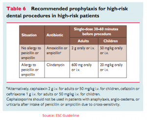 Antibiotic prophylaxis should only be considered for dental procedures requiring manipulation of the gingival or periapical region of the teeth or perforation of the oral mucosa including scaling and root canal procedures (Class IIa, Level C).